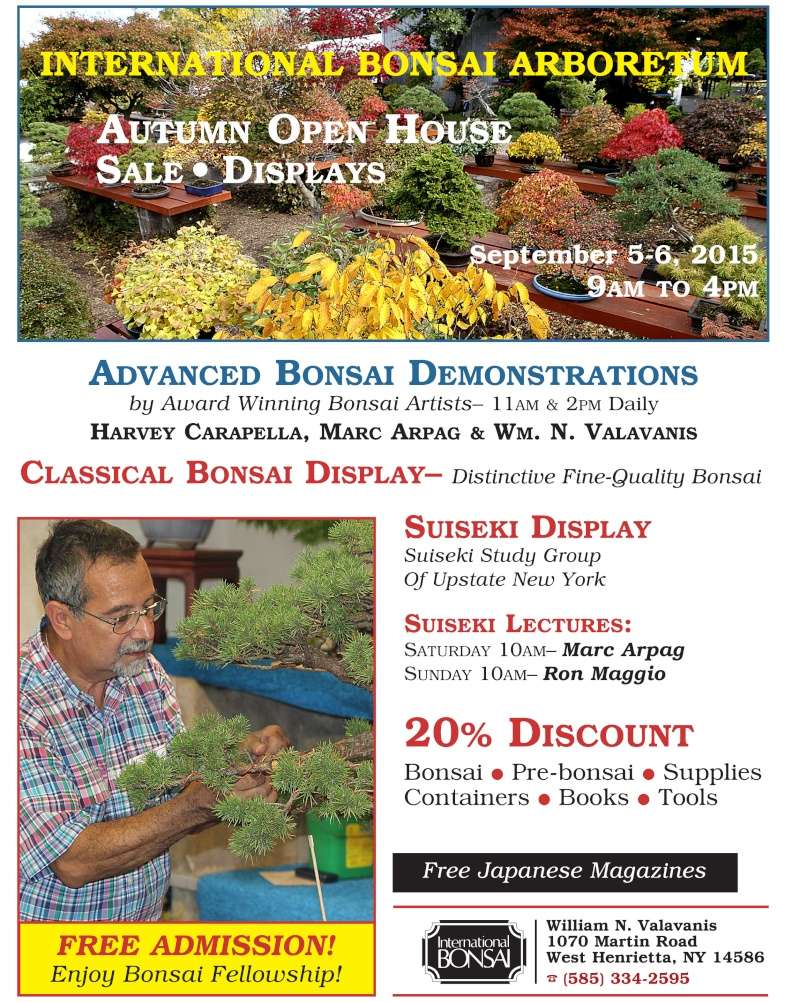 The International Bonsai Arboretum 2015 Autumn House & Sale will be held on September 5-6, 2015, in Rochester, New York. Bonsai lecture/demonstrations by award winning bonsai artists: Harvey Carapella, Marc Arpag and Wm. N. Valavanis will be held daily at 11am and 2pm. Bonsai and supplies will be on sale as well. Classical bonsai will be formally displayed and explained to better appreciate their beauty. Come, join us and walk through the beautiful bonsai display area as well as the sales area, growing area and tropical house containing numerous unusual indoor bonsai. Recent award winning bonsai will be formally displayed
